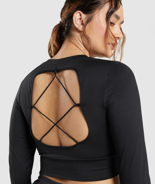 GYMSHARK PAUSE OPEN BACK LONG SLEEVE CROP TOP BLACK SPORTINĖ PALAIDINĖ