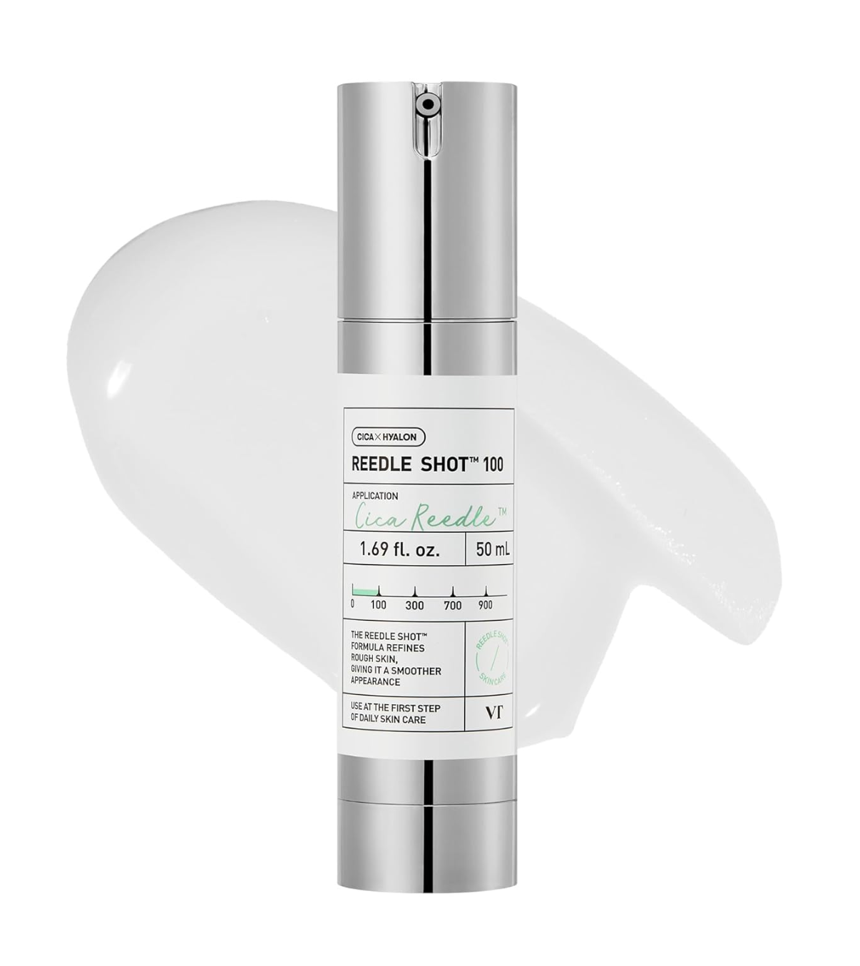 VT Cosmetics Reedle Shot 100 – tai švelnesnė Reedle Shot versija, kurią rekomenduojama naudoti pradedantiesiems. Ši priemonė yra intensyvaus poveikio su mikroadatėlių technologija. Ji yra praturtinta azijinės centelės ekstraktu, hialurono rūgštimi, niacinamidu, madekasozidu ir kt. odais naudingais ingredientais. Ši priemonė itin giliai įsiskverbia į odą, veikia priešuždegimiškai, ramina ir drėkina odą bei stiprina jos apsauginį barjerą. Reguliariai naudojant, galima pastebėti, kad oda tampa stangresnė ir labiau švytinti. Tinka visų tipų odai, įskaitant jautrią odą.